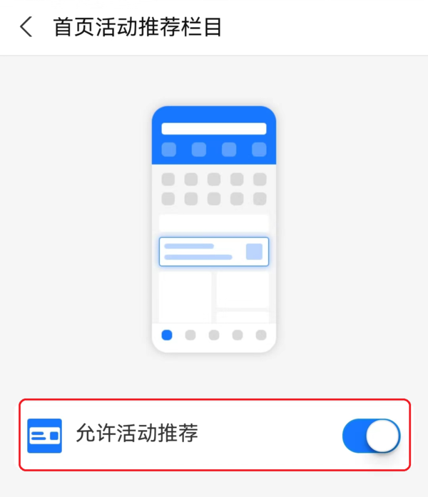 4、进入到支付宝的首页活动推荐栏目设置界面当中后,我们将【允许活动推荐】的功能开关滑动关闭。