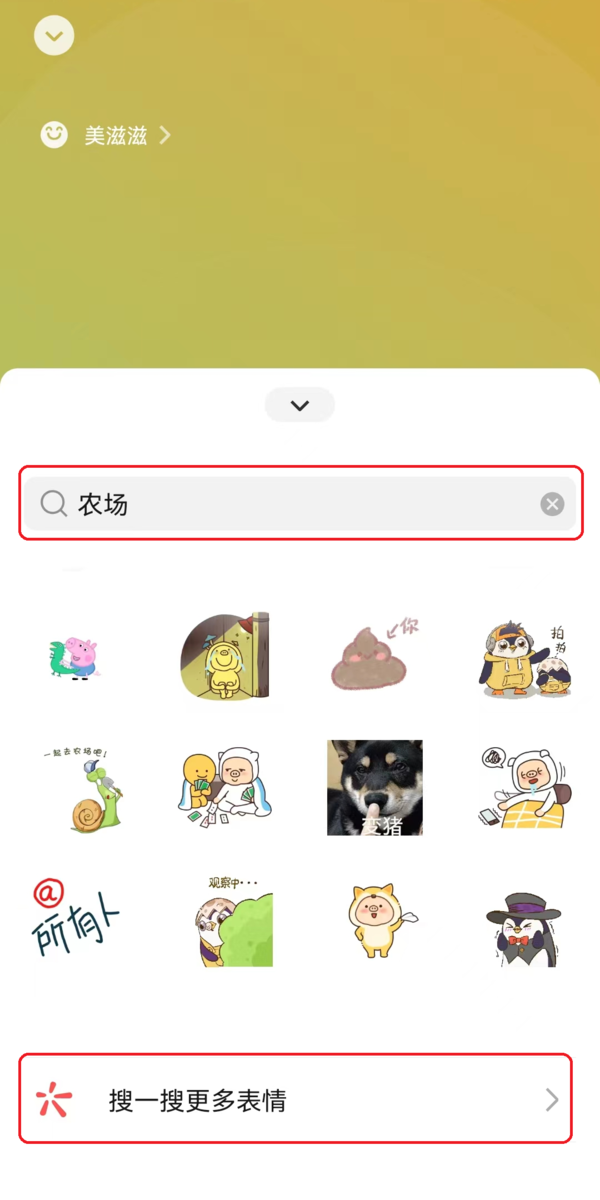 5、界面我们在搜索框中输入【农场】,然后将界面下滑到最底部,找到【搜一搜更多表情】选项,点击它。