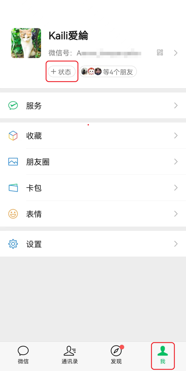 1、打开手机上的微信,点击界面右下角的【我】选项,然后找到【+状态】按钮,点击它。