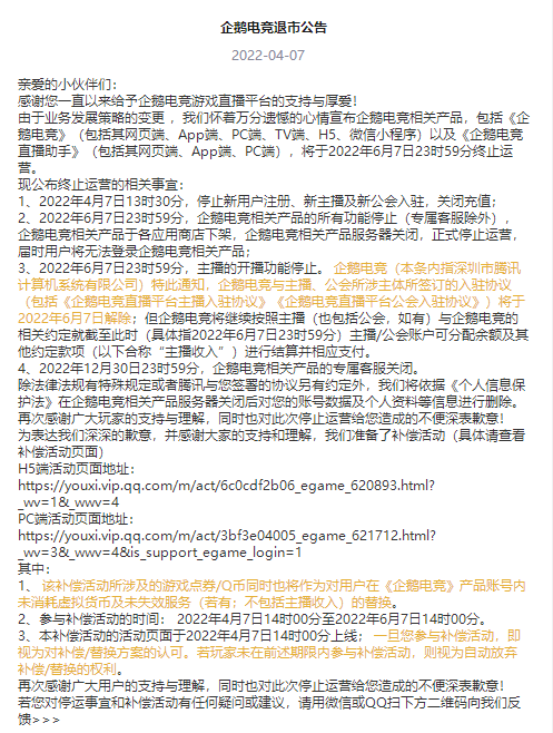 昨日,腾讯旗下移动电竞内容平台企鹅电竞发布了退市公告,将于2022年6月7日23时29分终止运营,退市的主要原因小编了解到因为业务发展策略的变更,企鹅电竞相关产品也终止运营包括网页端,APP端,PC端,TV端H5、微信小程序以及《企鹅电竞直播助手》(包括其网页端、App?端、PC?端)。昨天13时30分停止新用户注册、新主播及新公会入驻,关闭充值,2022?年?6?月?7?日?23?时?59?分企鹅电竞相关产品的所以功能停止(除专属客服外),各应用商店下架,相关产品服务器关闭,正式停止运营,届时用户将无法登录企鹅电竞相关产品,2022?年?12?月?30?日?23?时?59?分,企鹅电竞相关产品的专属客服关闭,相信大家在这个平台上一定都有自己喜爱的大主播,他们又将去向哪个平台呢?