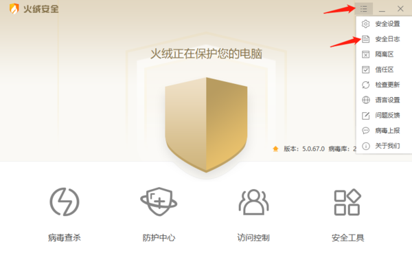来到火绒安全软件的主界面,点击右上角【最小化】左侧的按钮,即可伸展出扩展功能栏,在这里我们可以看到其中一项为【安全日志】,点击进入界面。