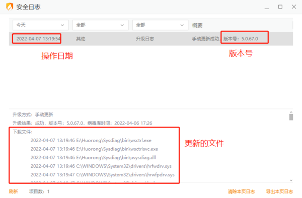 在该页面中,我们就可以看到刚刚更新的升级日志,不但可以看到版本号、操作日期,还有更新时所安装的文件。