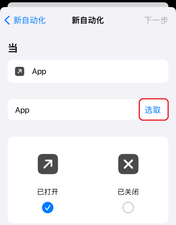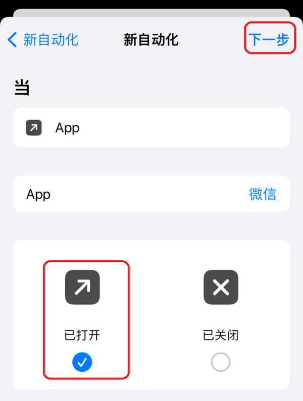 5、然后在新自动化界面中,选择【已打开】选项,然后点击界面右上角的【下一步】的按钮。