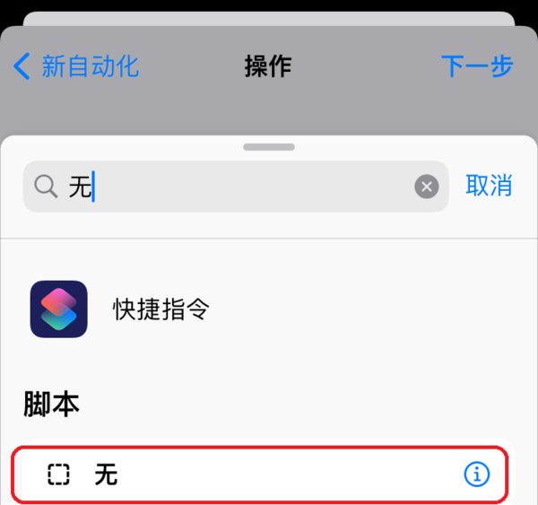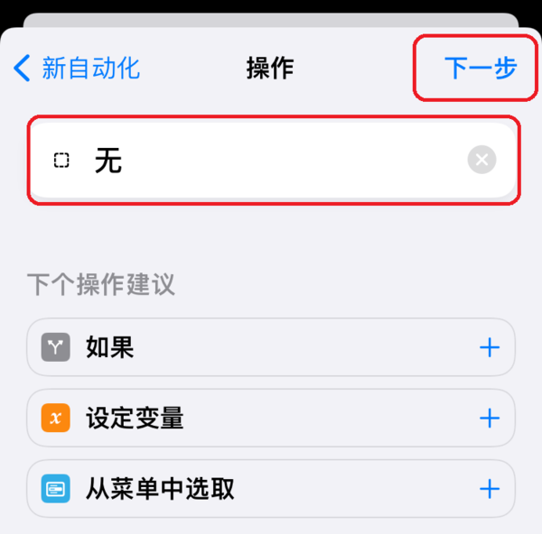 7、然后在操作中,找到【无】选项,并进行选择,然后点击界面右上角的【下一步】按钮。