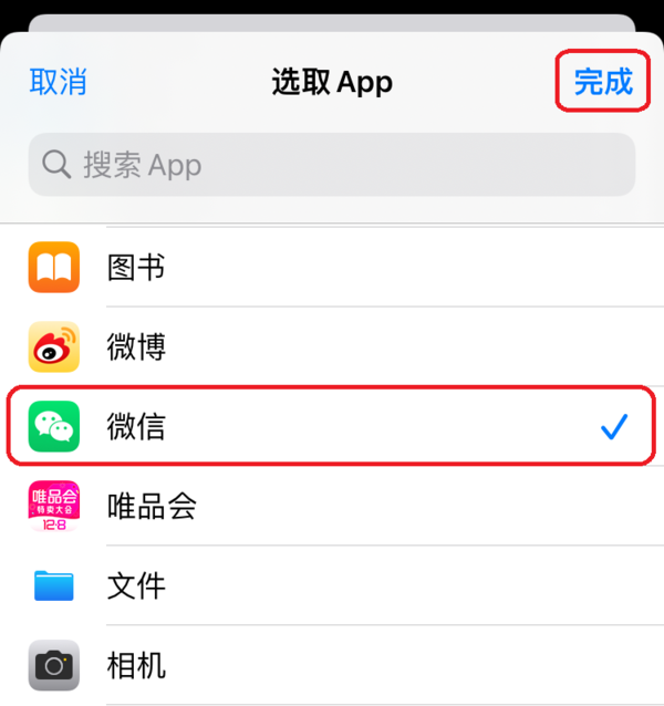 4、接着在选取App界面中,选项【微信】我们更换了图标的应用,然后点击右上角的【完成】按钮。