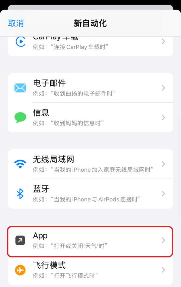 3、接着在弹出的新自动化界面中,选择【App】选项。然后点击【App】选项右侧的【选取】选项。