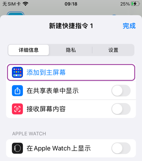 5、接着在弹出的新建快捷指令界面中,点击选择【添加到主屏幕】选项。