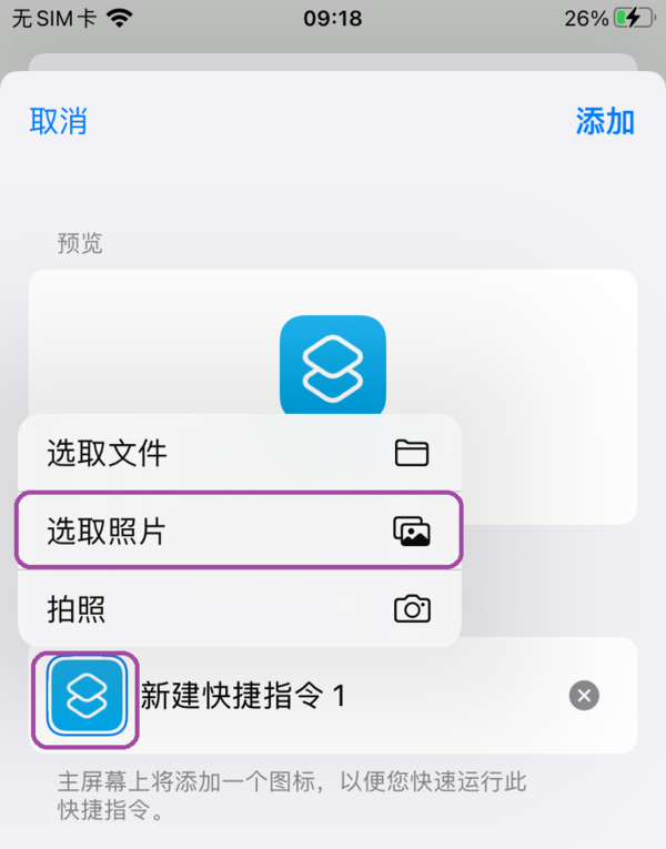 6、接着点击快捷指令的图标,然后在弹出的选项中选择【选取照片】选项,然后在手机的相册中选择要使用的微信图标的照片,并点击【选取】。