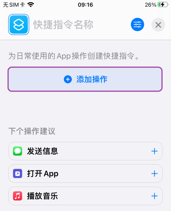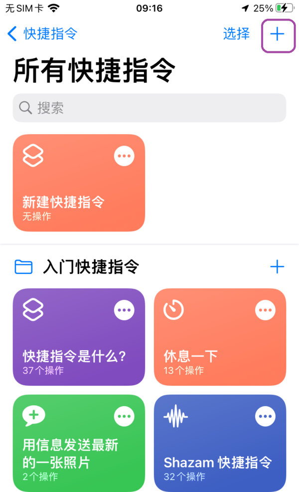进入到快捷指令功能界面当中后,点击界面顶部右上角的【+】加号按钮。