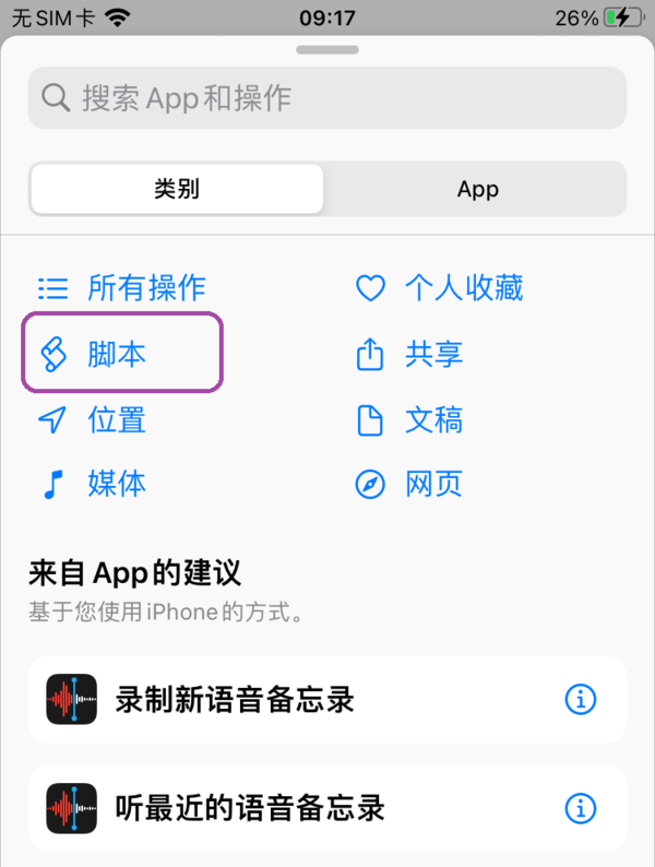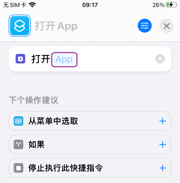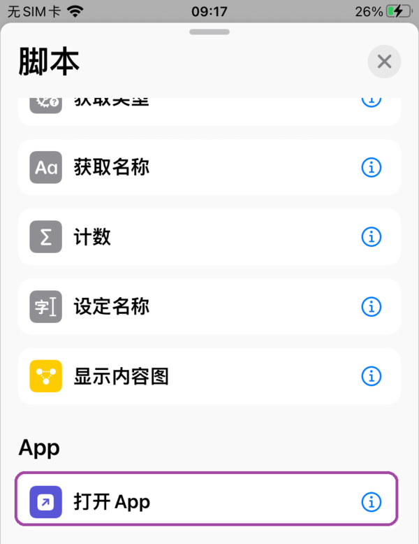 3、然后在脚本选项中,找到【打开App】选项,并点击选择它。