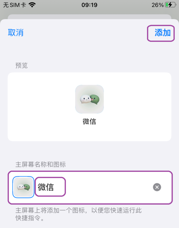 7、然后,我们将这个快捷之类的主屏幕名称进行修改,修改成【微信】,最后点击界面顶部右上角的【添加】按钮。