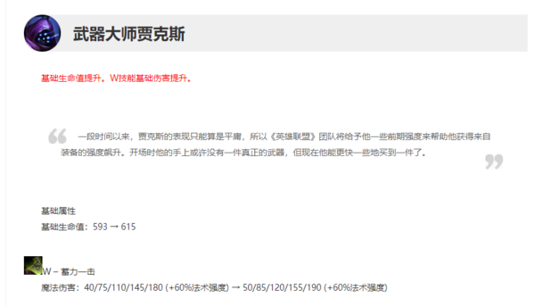 武器大师贾克斯基础生命值提升。W技能基础伤害提升,