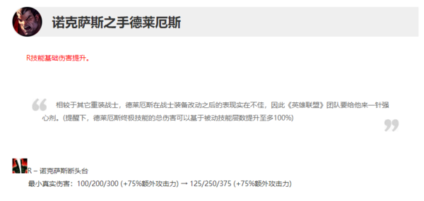 诺克萨斯之手德莱厄斯R技能基础伤害提升,增加了最小真实伤害值