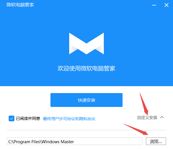1、双击打开下载好的微软电脑管家软件,如果不想要在默认的安装路径上安装该软件的话,点击【自定义安装】选项,然后点击路径右侧的【浏览】按钮,来进行安装路径的选择。