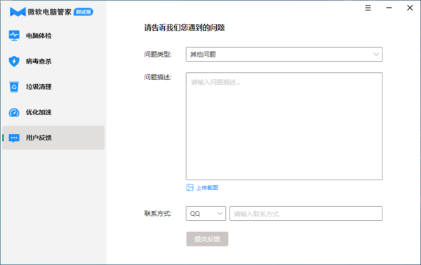 而除了基础的这四大功能外,微软电脑管家还提供了用户反馈功能,日常在软件的使用过程中,如果遇到什么问题,我们就可以直接进行问题的反馈与提交。同时,微软电脑管家整体界面设计的非常简单、干净,使用起来也是非常的简单。