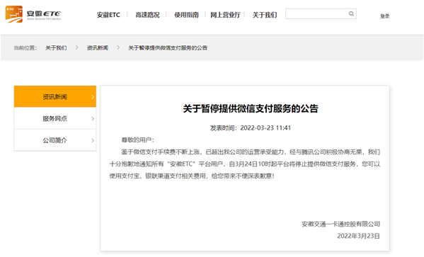 3月23日,安徽交通一卡通控股优先公司在官网发布公告,内容大致写到:鉴于维系你支付手续费不断上涨,与腾讯公司积极协商无果,安徽ETC平台用户将停止提供微信支付服务,可以使用支付宝,银联渠道支付相关费用。此次公告也是给使用安徽ETC的用户带来了一些不便,不能使用微信支付的软件还有很多,例如饿了吗外卖平台,淘宝app等等,说到淘宝近日也是在内测中开放了微信扫码支付的功能,继续和小编一起看看吧!