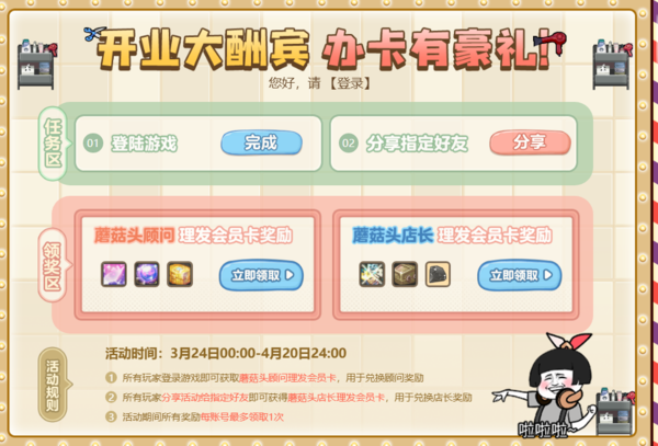 在这一活动中,我们只要登录游戏就可以领取蘑菇头顾问奖励;如果还分享给指定好友,那么我们还可获得更高级的蘑菇头店长奖励。