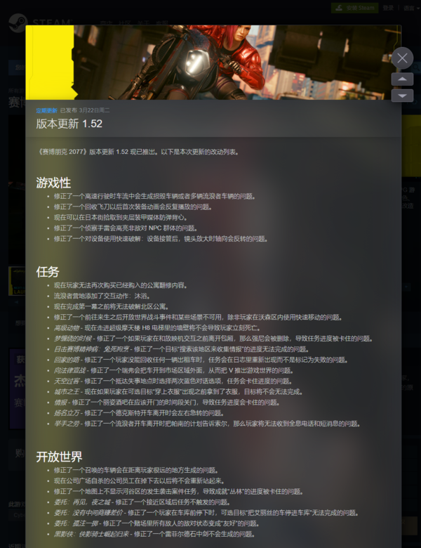 以上,就是财神爷站小编为大家总结的关于赛博朋克2077游戏1.52最新版本的更新上线时间以及具体的更新内容的介绍了。