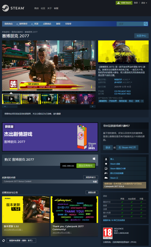 在3月22日昨天,CDPR官方宣布,《赛博朋克2077》游戏1.52最新版本已经在各大平台上更新上线,而《赛博朋克2077》剧情拓展包目前正在使用REDengine引擎制作中。?除此之外,目前本作在GOG平台可享5折优惠,仅售149元。