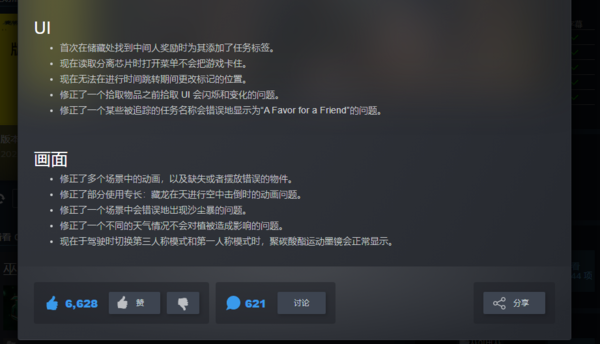 修正了一个地图上不显示河谷区的发生袭击案件任务,导致成就“丛林”的进度被卡住的问题。