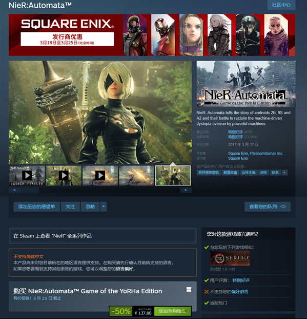 近日,Square?Enix工作室多款游戏在Steam上推出特惠活动,包含《尼尔:机械纪元》、《古墓丽影》系列、《最终幻想》系列等部分游戏特惠,其中《尼尔:机械纪元》罕见推出折扣,而且是以半价史低推出,折后只需要137元,同样是SE旗下的古墓丽影全系列整合包限时八七折特价,包含《古墓丽影1-9》、《古墓丽影:暗影》、《古墓丽影:崛起》等系列以及相关DLC,单系列低至9折,经典的《古墓丽影9》仅需9.75元即可入手。