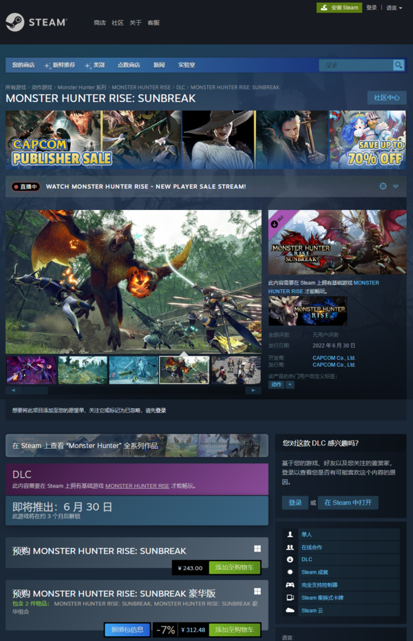 根据官方正式公布的消息,怪物猎人崛起曙光游戏将于2022年6月30日正式发售推出,3月15日晚正式开启预售,同时大家目前就可以在Steam游戏平台上看到这款游戏了。