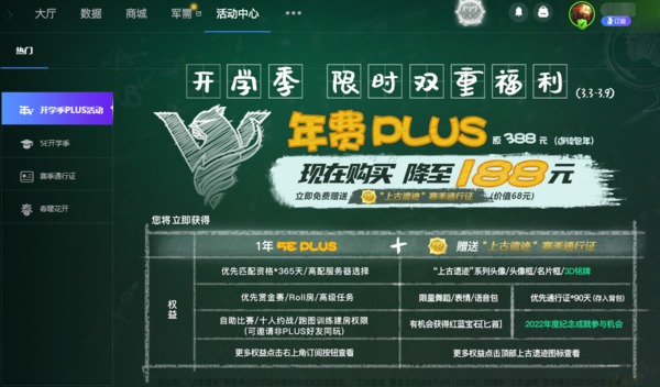 在2022年3月3日至同年3月9日,5E对战平台开设PLUS会员特惠,玩家可凭188元价格(原价388)购买年费PLUS会员加赛季通行证,PLUS会员可以让玩家在5E对战平台拥有更好的体验,赛季通行证则是让玩家在完成赛季任务之后可获得更好、更稀有的游戏奖励。对于想买5E-PLUS和赛季通行证的玩家们可不要错过了,毕竟最后一天了!