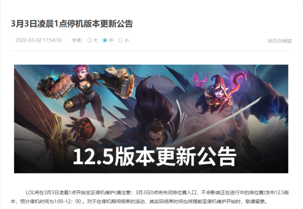 就在昨天下午,英雄联盟12.5版本在官网上发布了3月3日凌晨1点停机版本的更新公告,公告内容表示,LOL将在3月3日凌晨1点开始进行全区停机维护(请注意:3月3日0点将关闭排位赛入口,不会影响正在进行中的排位赛)发布12.5版本,预计的停机时间则为1:00-12:00?。而对于在停机期间结束的活动,其实际结束时间也将提前至停机维护开始时,敬请留意。其实这就是英雄联盟游戏12.5最新版本的更新发布时间了。