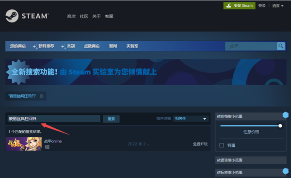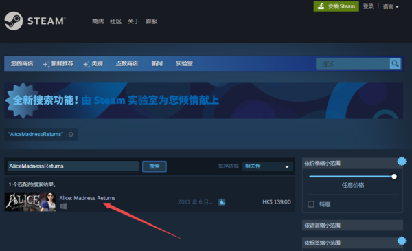 爱丽丝疯狂回归游戏在steam平台上叫做AliceMadnessReturns,我们只需要在steam平台的搜索框中输入这个名字,就可以搜索到这款游戏了。