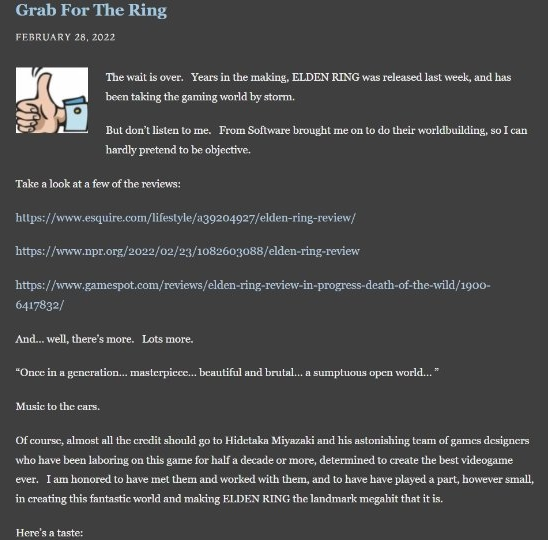 当然,几乎所有的功劳都应该归功于宫崎英高和他惊人的游戏设计师团队,他们在这款游戏上辛勤劳作了5年或更长时间,决心创造出有史以来最好的电子游戏。我很荣幸遇见他们并与他们一起工作,在创造《艾尔登法环》这个梦幻般的世界,并使其成为具有里程碑意义的3A游戏方面,我做了一点微小的工作。