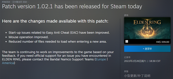 在玩家们差评爆破以及发行商万代南梦宫发文致歉后,在2月26号艾尔登法环,PC版1.02.1补丁更新发布,补丁日志显示,1.02.1补丁将尝试修复部分因为反作弊系统EAC引起的问题等,具体来看,由于使用Easy?Anti?Cheat(EAC)反作弊系统,艾尔登法环启动游戏时存在一些问题,现在这方面有所优化。另外,在游戏进入新场景时会加载大量文件、可能造成瞬间顿卡,对此进行了优化、降低了每次加载新场景需要加载的文件数量。同时,补丁针对鼠标操作体验也有所优化。