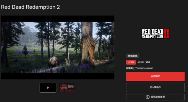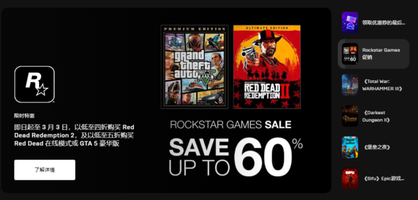 最近小编一直在关注Epic游戏平台,但就在2022年2月25日,小编突然在Epic的首页上发现了R星游戏打折的消息,再根据消息的提示,我们可以得出:在Epic游戏平台上的这波R星游戏打折,是从2022年2月25日至同年的3月3日,活动持续7天;对R星游戏感兴趣的玩家可不要错过了。