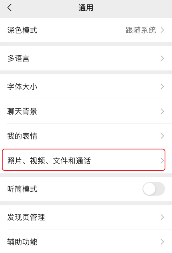 3、进入到微信的通用设置界面当中后,找到【照片、视频、文件和通话】选项,并点击进入。