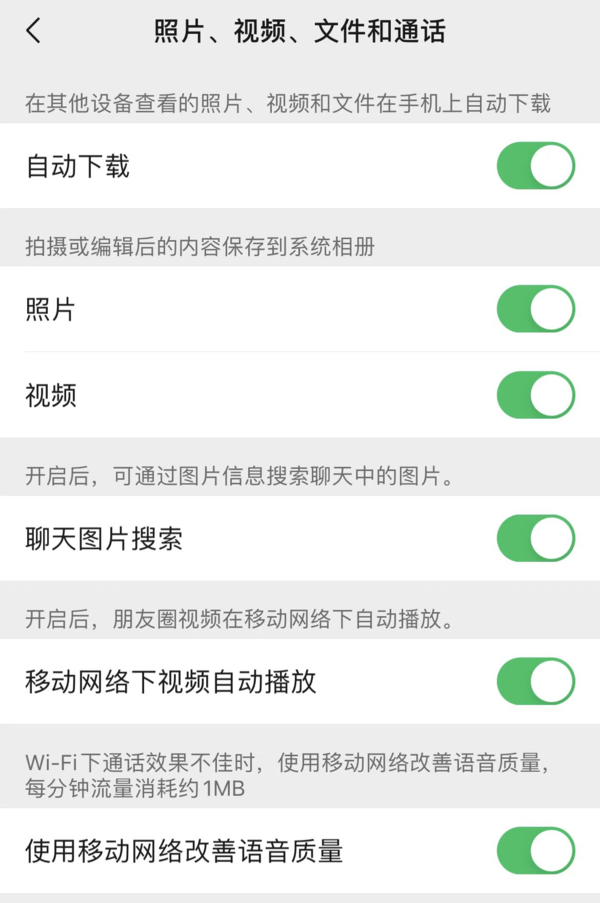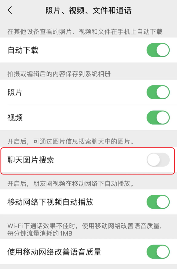 4、进入到微信的照片、视频、文件和通话的设置界面当中后,找到【聊天图片搜索】功能,并将该功能右侧的开关滑动打开。