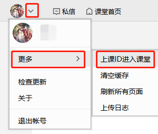 在电脑上登录腾讯课堂学生版客户端后,点击页面左上角头像的向下箭头,在更多选项中,点击“上课ID进入课堂”。之后在弹出的窗口中,输入课堂ID,点击“确定”就可以了。