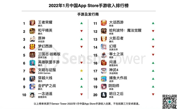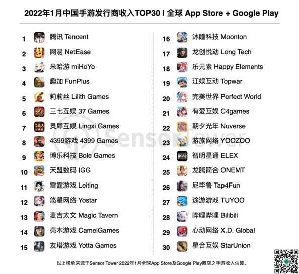 昨日,移动应用数据分析公司Sensor?Tower公布了2022年1月中国手游发行商在全球App?Store和Google?Play的收入排名,从1月App?Store手游收入排名来看,王者荣耀又重回ios榜首第一,随着新赛年、新英雄、新皮肤等海量内容上线,1月《王者荣耀》收入环比增长92%,重回中国iOS手游畅销榜榜首,腾讯游戏收入相应的环比增长22%。和平精英虽然收入下滑,但依旧排名第二,在二月春节期间回归了很多衣服,武器皮肤等等,下个月可能会有所上涨,《穿越火线》手游于1月19日推出新版本“虎虎生威”,随着新角色、新皮肤等大量内容释出,游戏收入环比增长58%,重回手游畅销榜前十。