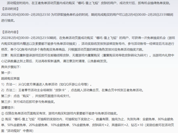 在2月4号到2月28号在王者免单活动页面内成功购买“哪吒-雪上飞焰”皮肤的用户,成功支付后,即有机会抽得免单奖励,在购买活动期间即可参与抽奖,这次活动只限QQ区系统的玩家,可抽取如下奖励之一,数量有限,抽完为止,先到先得:全额免单、80%金额免单、50%金额免单、20%金额免单、10%金额免单、5%金额免单、皮肤碎片×2、英雄碎片×2、钻石×10(奖励份数可在活动页面“活动规则”中查询)还没有参与的小伙伴抓紧行动吧!