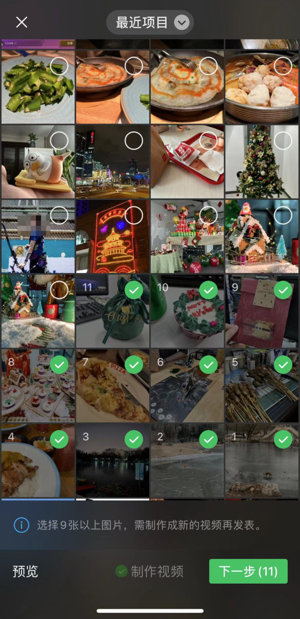 在使用iOS最新版本的微信发朋友圈的时候,当我们选择超过9张图片最多20张图片的时候,在图片选择界面的底部,我们可以看到软件默认勾选了一个叫做【制作视频】的功能,然后点击【下一步】按钮。