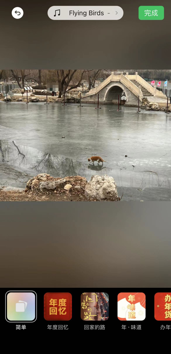 最后,进入到视频的制作页面当中,在界面的顶部我们可以选择不同的视频音乐,在底部可以选择不同的视频模板,制作成功后,点击右上角的【完成】按钮即可发布视频作品了。?其实就是等于将我们的超过9张以上的图片制作成视频的形式来进行发布了,其实就是从单张图片变成了一个视频的差别。