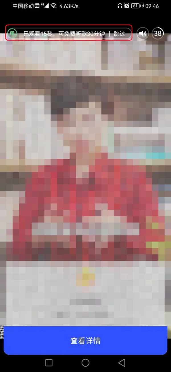 3、当我们成功的观看完15秒的视频广告后,在窗口左上角的位置会有【已观看15秒,可免费听歌30分钟】的提示,然后我们点击后面的【跳过】按钮,就可以跳过广告了。