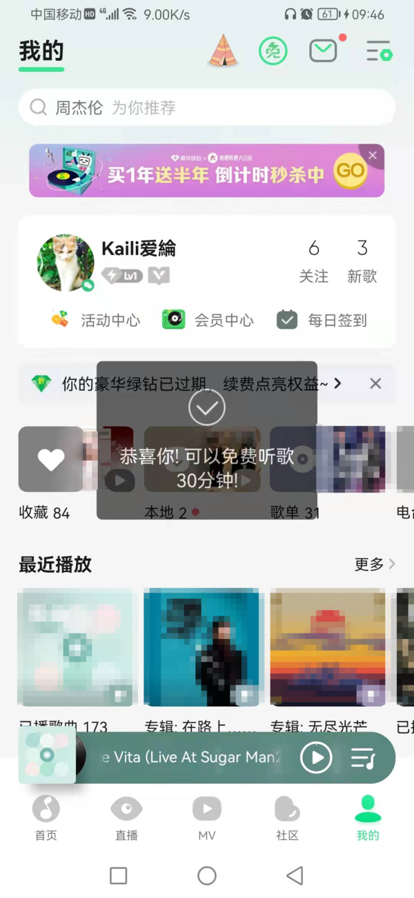 4、回到QQ音乐的软件界面当中后,我们可以看到【恭喜你!可以免费听歌30分钟!】的提示信息,此时我们便可以开始听VIP才可以听的歌曲了。
