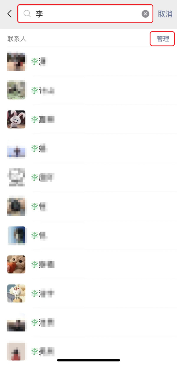 2、接着我们就可以搜索出微信联系人中带【李】的好友了,而在联系人列表的右上角,有一个【管理】按钮,点击它。
