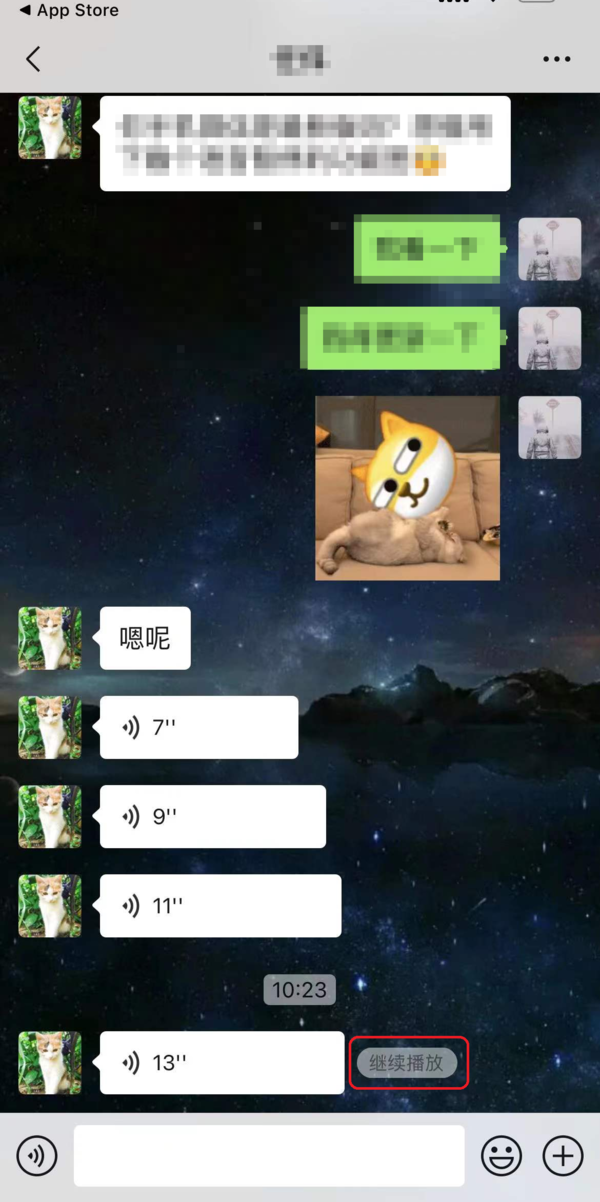 不过还有一点内容是需要大家注意的,就是目前只支持一条长语音的继续播放,如果点了其他语言内容的话,那么之前语音消息的继续播放按钮就会消失。但是如果你在暂停了一条语音消息后,就算是退出当前的对话界面,回到该界面的时候继续播放的标记还是存在的。