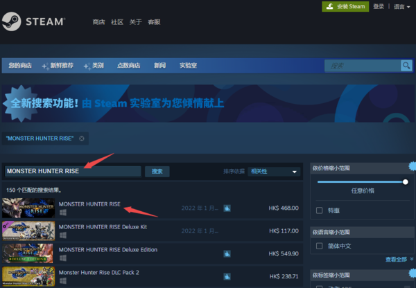 介绍完了在Steam平台上发售的怪物猎人崛起游戏的内容后,可能有的玩家新手会直接在steam平台上输入游戏的中文名字去搜索,但是却一直找不到这款游戏,那么怪物猎人崛起游戏在steam平台上到底叫什么呢?怎样才能搜索到这款游戏呢?继续往下看吧。