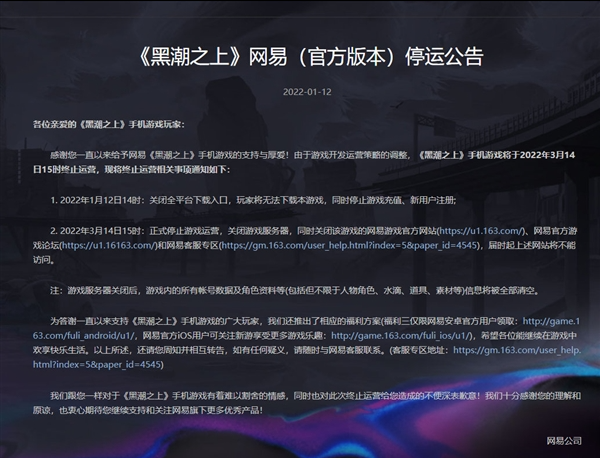 昨天,网易黑潮之上游戏官方宣布该游戏今年3月14日15时终止运营,同时关闭官方网站、论坛和客服专区等一切《黑潮之上》相关的官方网站及社区,游戏内的所有账号数据将被清空,并发布了相关停服时间和补偿福利,昨天,黑潮之上全平台关闭下载入口,关闭游戏内充值和新用户注册,停服原因是由于运营活动问题遭到了大量玩家的反对,造成了严重的玩家流失,从而导致游戏走下滑路线,在去年年末就已经停止更新了,和幻书启世录停运一样,会有补偿福利,关服之后在梦幻西游手游、大话西游手游及乱斗西游?2游戏中获得对应的网易游戏成长福利,希望网易可以从这两款停服的游戏中找到原因,开发出更好玩的卡牌游戏。