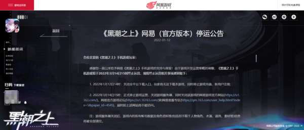 而在黑潮之上游戏官方发布公告之时,也就是1月12日的14时之后,黑潮之上游戏将关闭全平台的下载入口,同时关停游戏的新用户注册接口以及游戏的充值接口。