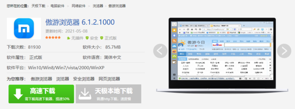 在文章最上面的软件推荐中,点击“直接下载”键,就能下载傲游浏览器的安装包。当然了,也可以点击“查看详情”键,跳转到软件详情页面,进一步浏览软件内容信息后,再使用本地下载安装。