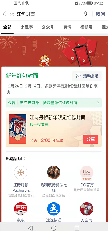 微信红包封面联合的17个品牌包括:江诗丹顿、哈利波特:魔法觉醒、热风、安慕希、DR钻戒、第五人格、I?DO、京东、娇韵诗、金典、黎明觉醒、万宝龙MONTBLANC、小鹏汽车、笑果、永辉生活、妮维雅;每个品牌每天会在不同时间段发放限量红包封面。