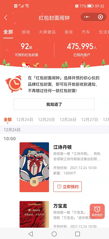 2022年与以往抢红包封面方式有所不同,微信特意提供抢红包闹钟功能,进入微信红包封面领取页面里,就可以设置“红包封面闹钟”,只要定了闹钟,就可以在开抢前收到通知,然后提前5分钟前往官方红包封面区等候,你喜欢的红包封面就不会错过了。