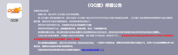 昨天,腾讯游戏QQ堂宣布在明年4月20日停止中国大陆的运行,将在11点关闭游戏服务器,届时用户将不能正常登陆游戏。停服公告上显示,2021年12月16日11点,关闭Q币/Q点支付和新用户注册,2022年4月20日11点,游戏服务器关闭,游戏官网、论坛、专属客服关闭。官方表示,游戏服务器关闭后,除法律法规另有规定或腾讯与您签署的协议另有约定外,游戏内的所有帐号数据及角色资料等信息将被全部删除,